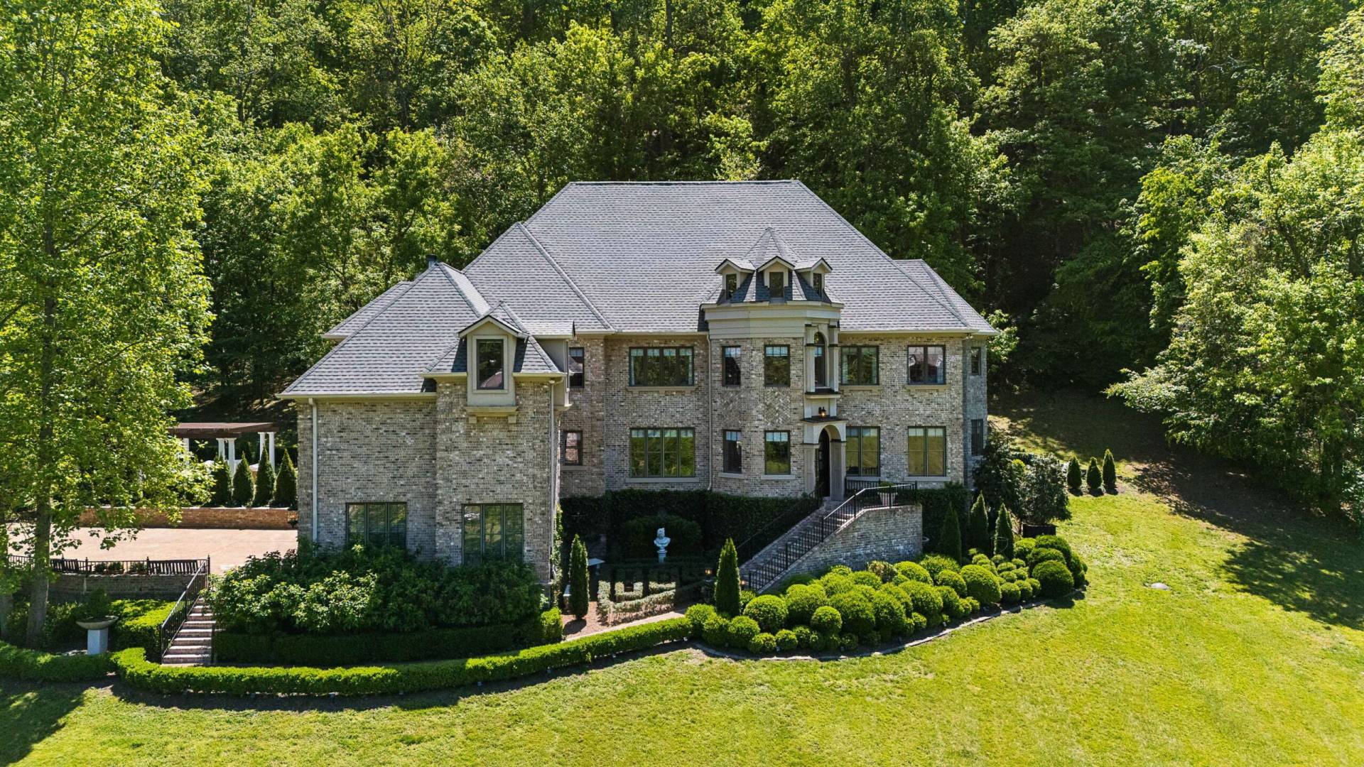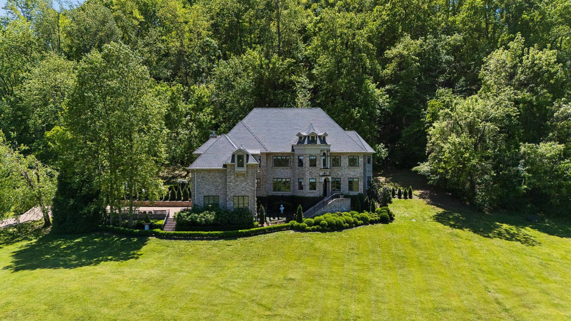 Does security, privacy, nature, and stunning views with the freedom to expand without hassle speak to you? Nestled in the heart of Bird Song Hollow at the foot of the iconic Natchez Trace Double Arch Bridge is Natchez Valley, a 24/7 gated, 215- acre nature sanctuary of only 19 estates. Wishing Trees is situated in the center of this exclusive community on a premium 6-acre lot, and offers European elegance, and architectural mastery, drawing inspiration from the rich traditions of England, France, and Italy. This exquisite, elegant home showcases a harmonious blend of brick and stone, complemented by wood exterior elements. Its striking steep rooflines and two-story turret, featuring dormer details, create a captivating silhouette against the surrounding lush woodland and formal gardens, with a dry/wet stream that runs the width of the property. The exterior showcases formal English garden designs, a courtyard parterre designed by the head gardener from the late Oscar de La Renta’s estate, romantic growing vines, and roses which transport you to a storybook cottage in the Cotswold’s. Enveloped in lush mature landscaping, a secret garden with pergola, architectural stone garden elements, topiaries, mature trees and rolling hills not only elevate the beauty and charm of the estate but also significantly increases its value according to experts such as Charlie Munger, Vice Chairman of Berkshire Hathaway. The homeowners here self-manage the HOA which permit farm animals, and just recently voted to also include chickens. See the HOA documents on this site. Building codes allow for further expansion to this property if desired such as adding an out-building, detached garage or studio, and even a swimming pool. This friendly community of entrepreneurs has a private Facebook group page for residents to communicate, and share service provider recommendations etc. We elect among ourselves, president, treasurer, etc. There are no rental restrictions. Very low real estate taxes are only $6,000 annually – the tax band rate transfers to the new owner.